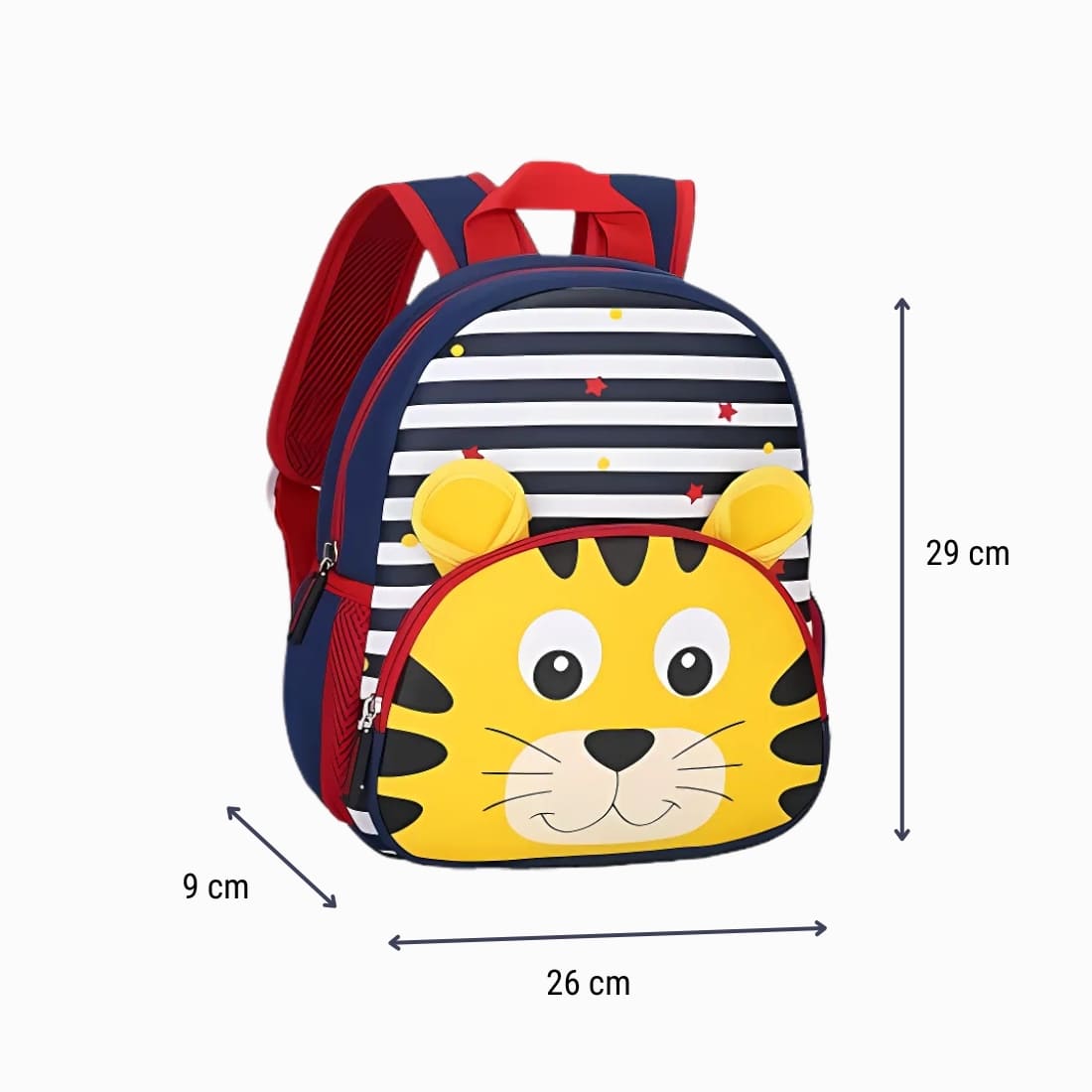 Ce cartable mesure environ 29 x 26 x 9 cm et offre une contenance adaptée aux affaires essentielles des tout-petits : gourde, goûter, doudou ou cahier. Les bretelles rembourrées sont réglables pour suivre sa croissance tout au long de la maternelle, tandis que le dos matelassé et les côtés en maille assurent une bonne aération.