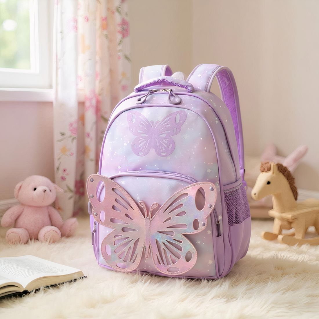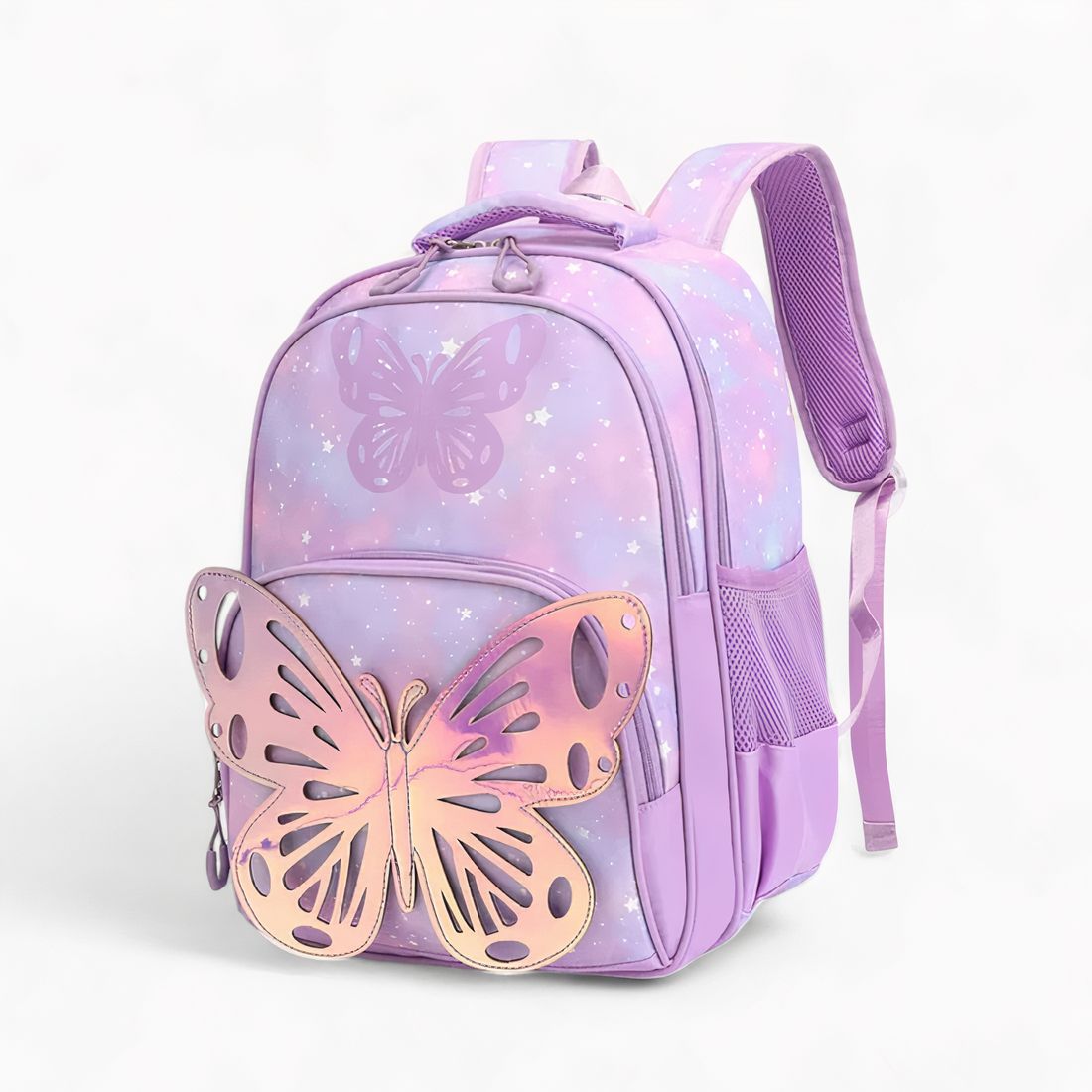 Les couleurs pastel dégradées, le fond étoilé scintillant et le grand papillon en relief font de ce cartable un véritable coup de cœur pour les filles créatives. Chaque détail, du zip renforcé aux finitions soignées, a été pensé pour plaire aux petites rêveuses.
