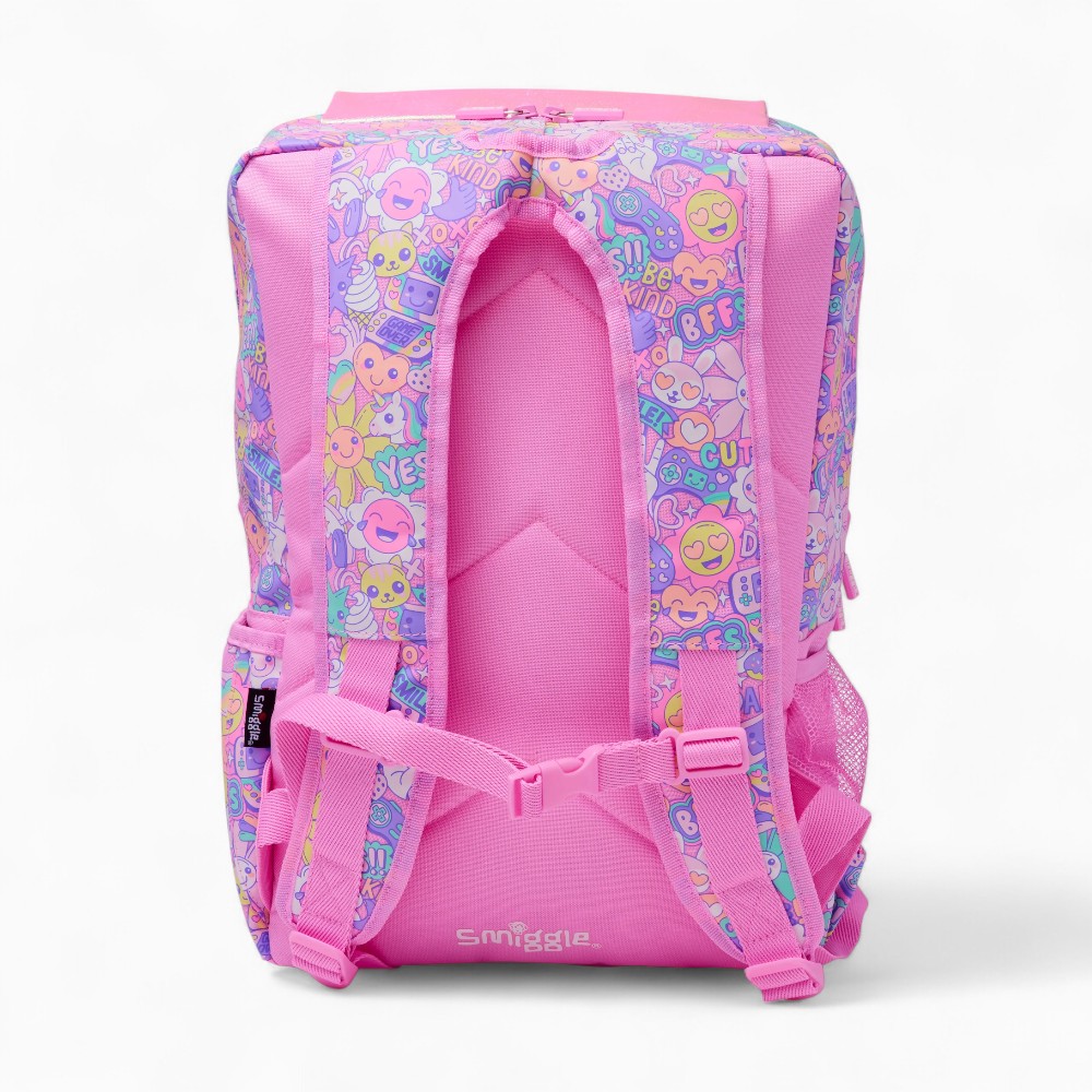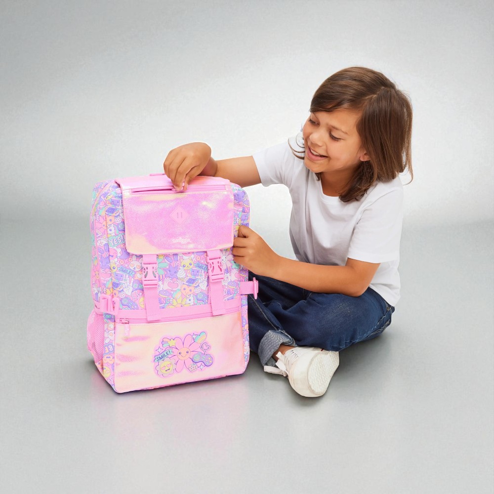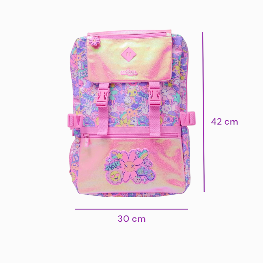 Avec son rabat brillant façon holographique et ses motifs kawaii, ce cartable fille à rabat brillant motif pastel fun donne immédiatement le ton d’une rentrée pleine de joie. Des petits visages rigolos, des glaces, des smileys et des messages positifs couvrent toute la surface pour une explosion de bonne humeur tous les jours.