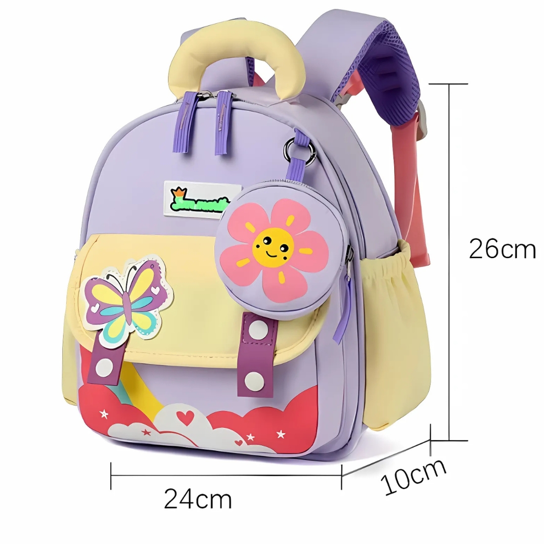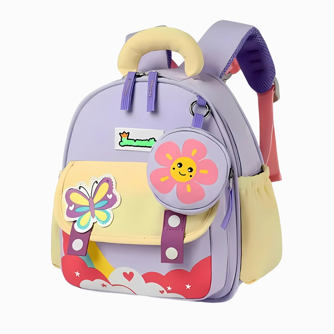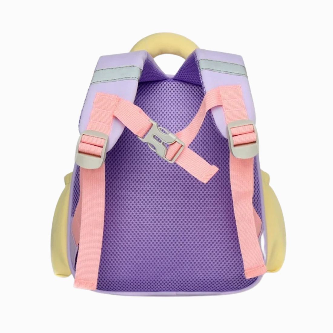 . Avec ses illustrations amusantes et ses couleurs tendres, il transforme chaque départ à l’école en moment de joie. Violet et jaune pastel se mêlent pour un look de dessin animé qui invite à l'imaginaire.