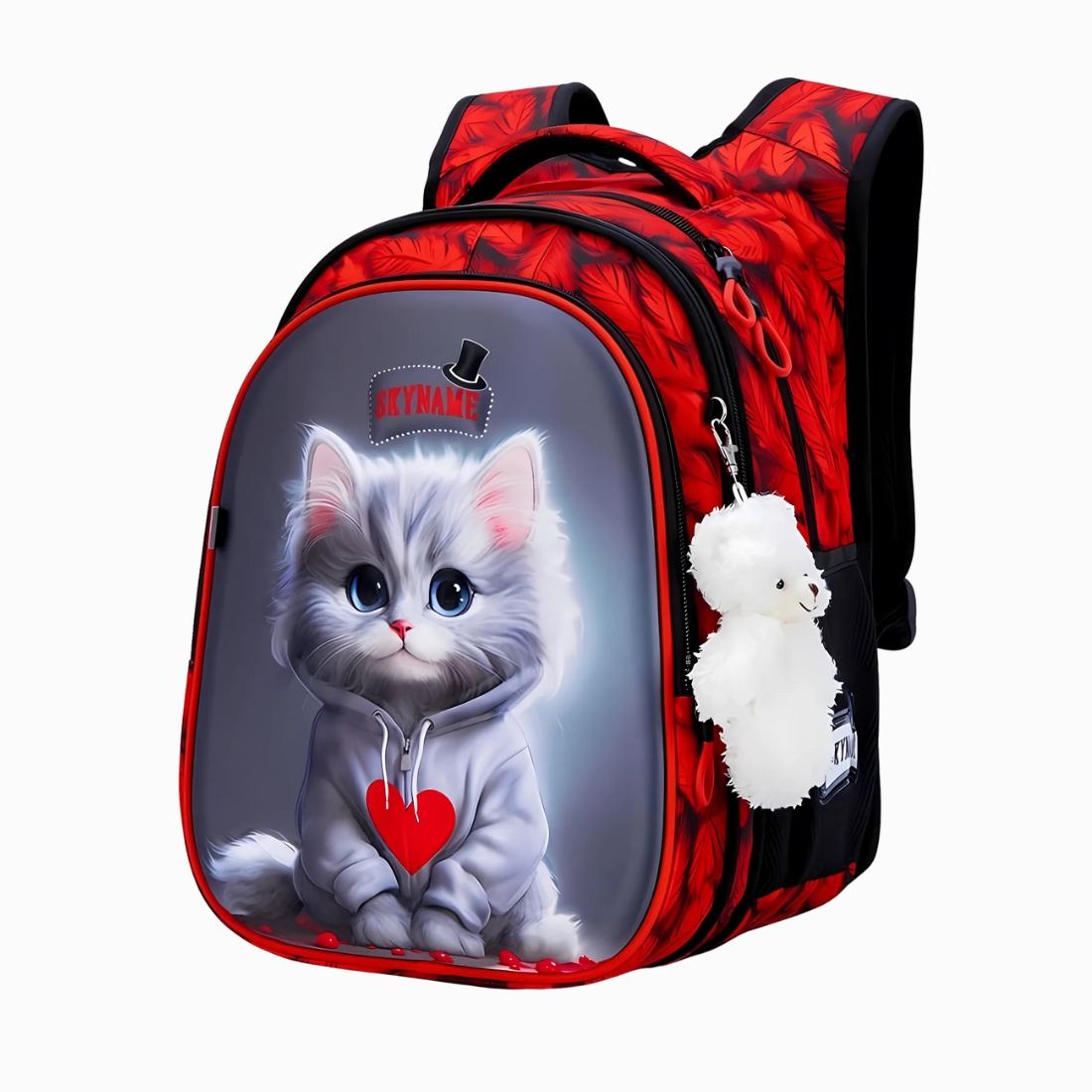 Le visuel craquant du chat gris en sweat à capuche, accompagné d’un petit porte-clés nounours, crée un lien émotionnel immédiat. Ce look attendrissant est combiné à une touche de rouge dynamique et de plumes stylisées.