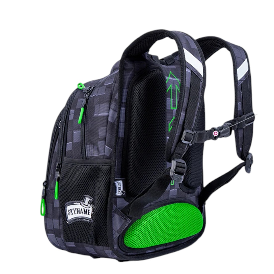 Le motif pixelisé et le design façon manette séduiront les fans de jeux vidéo. C’est un cartable qui affirme son style sans compromis. Il est également équipé de bandes réfléchissantes à l’avant, sur les côtés et sur les bretelles, pour être visible en hiver lorsque les départs et le retours se font dans la nuit.