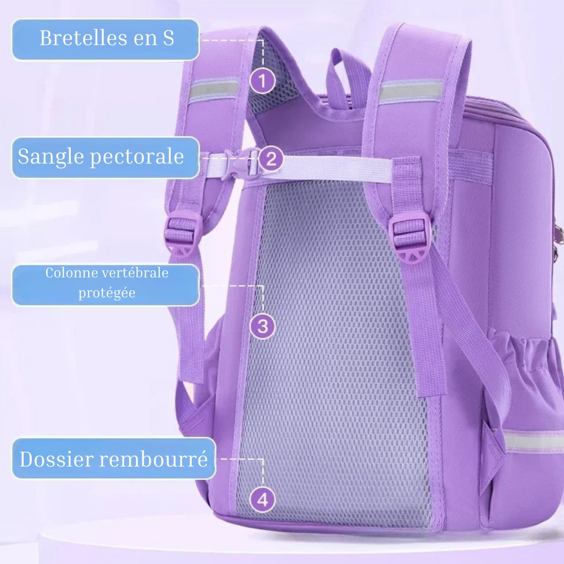 Les bretelles sont larges, douces et réglables pour s’ajuster parfaitement à la morphologie de votre fille, tout en prévenant les douleurs dorsales. Une sangle de poitrine permet également une meilleure répartition et un maintien optimal du sac.
