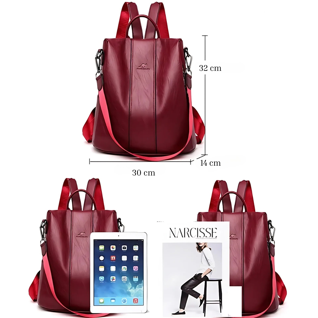 Cartable sac à dos bordeaux avec bandoulière pour femme