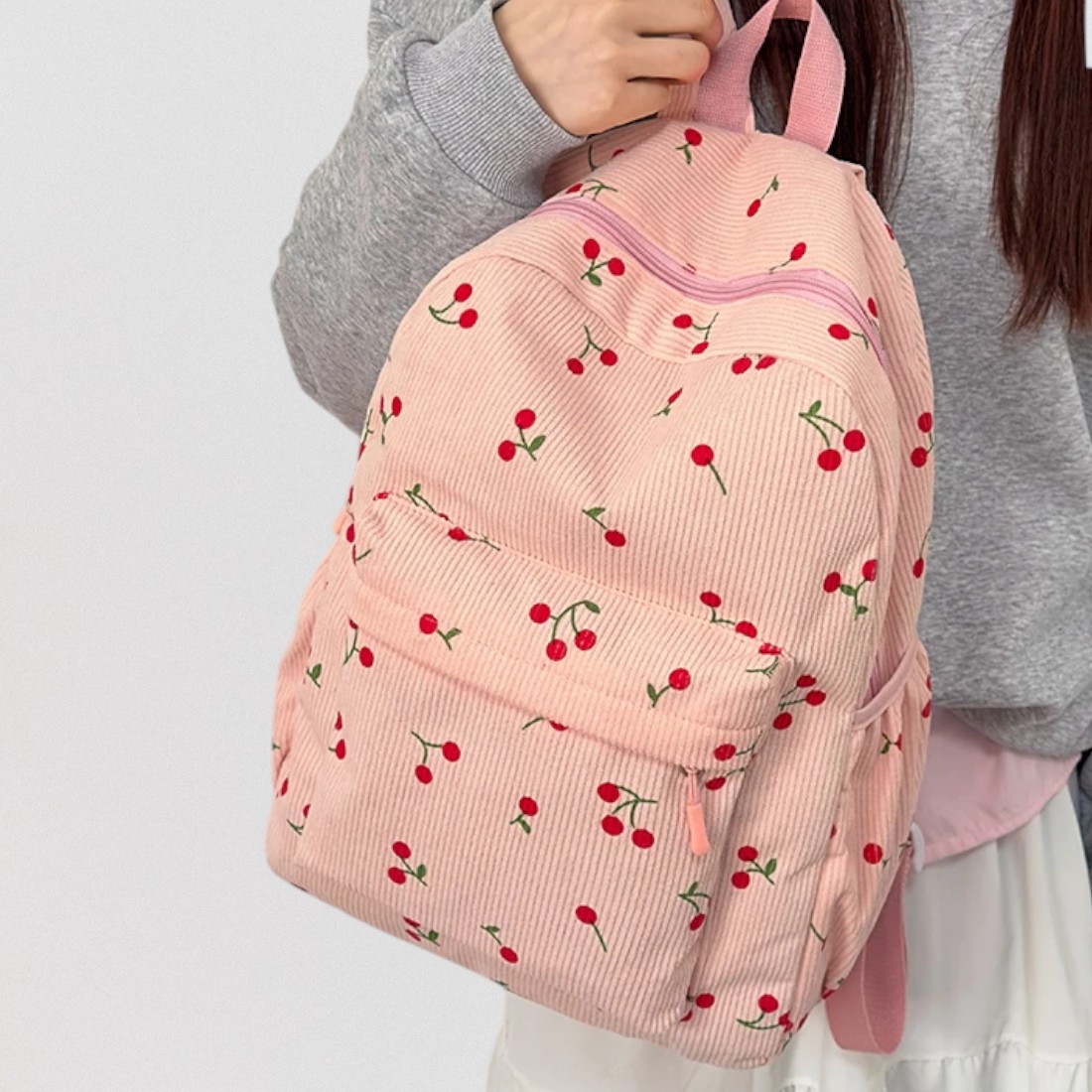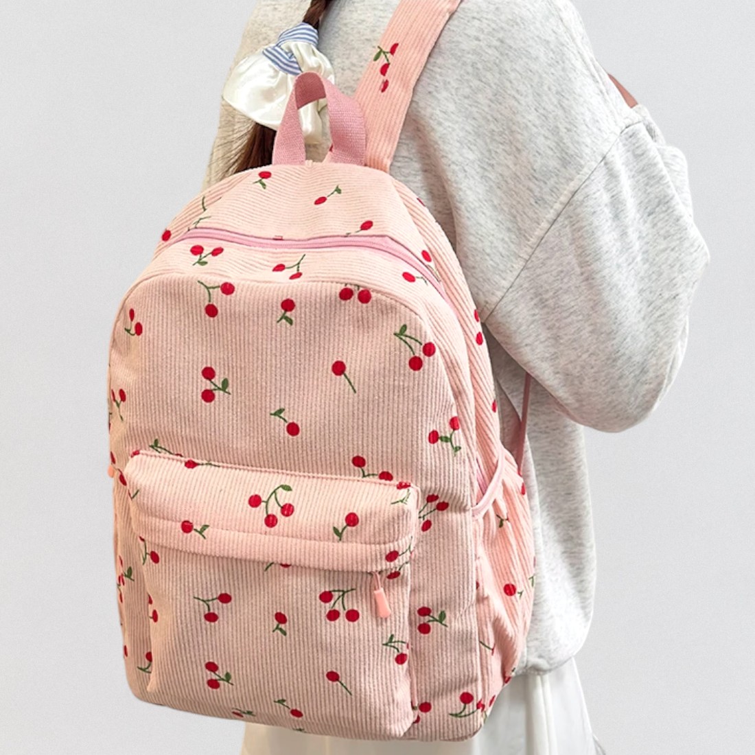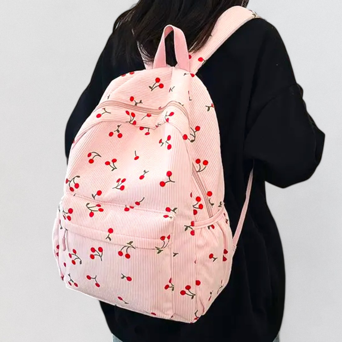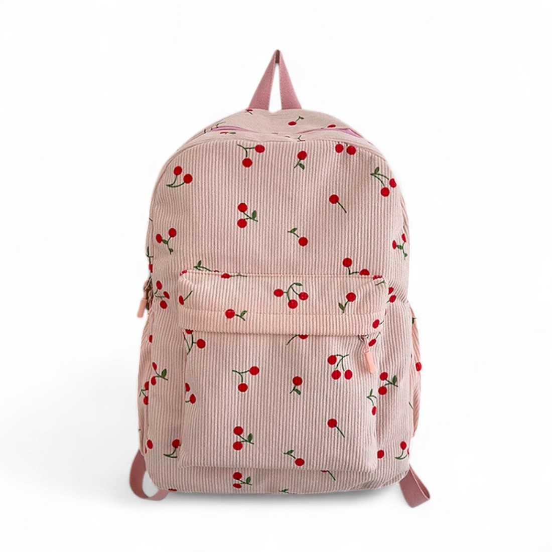 Ce cartable sac à dos rose cerise en velours côtelé a été pensé pour accompagner les journées chargées avec style et douceur. Son tissu en velours côtelé donne un côté rétro irrésistible, tandis que les petites cerise ajoutent une touche de fantaisie pleine de charme.